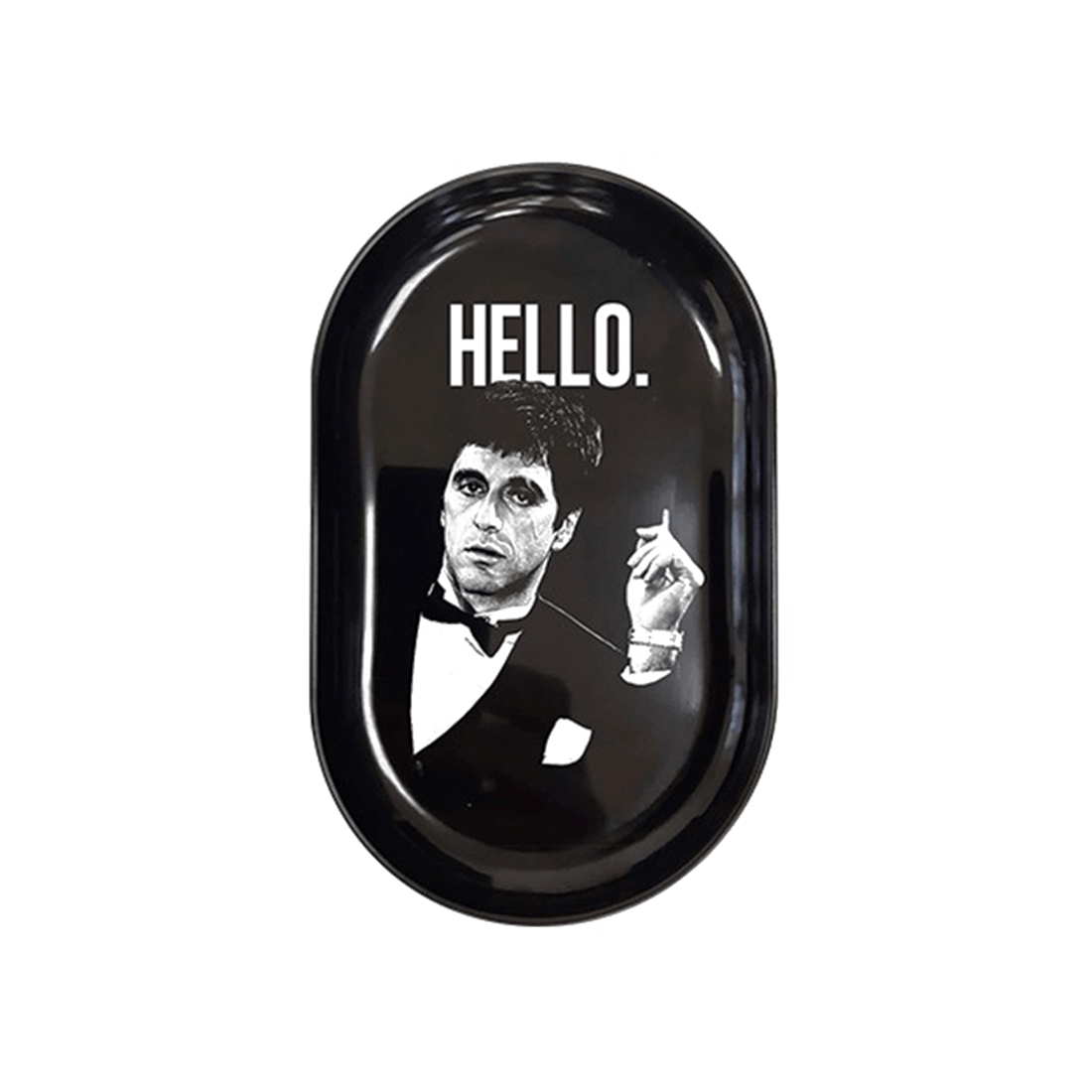 Roll your joints on the Metal Tray Hello while Tony Montana, better known as Scarface, watches you intently.